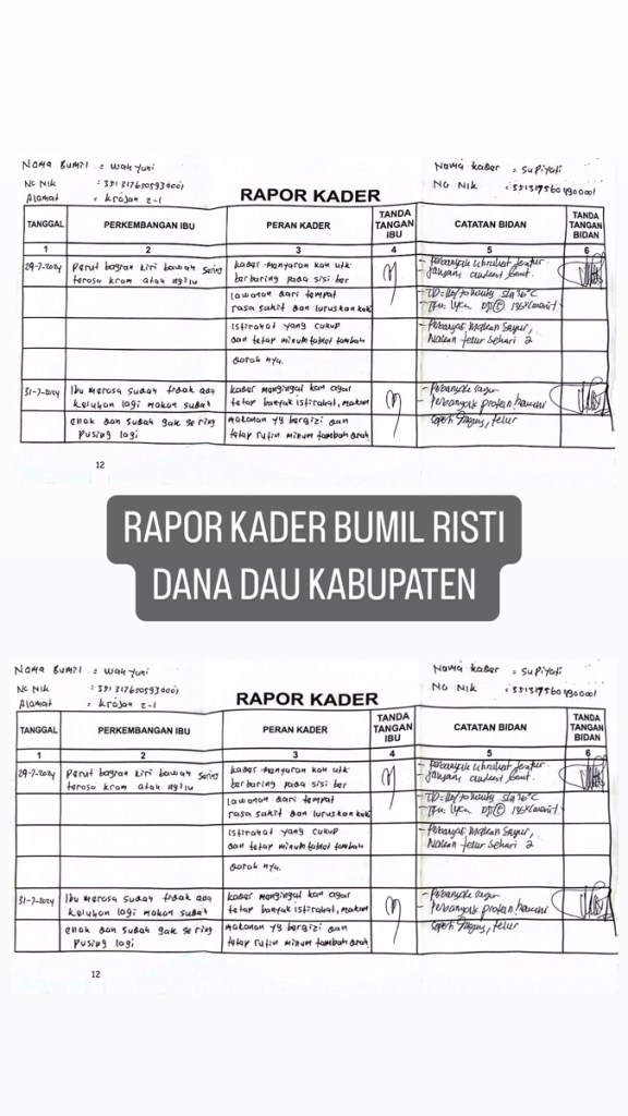 Dokumentasi pendampingan bumil risti dengan supiyati pada bumil atas nama ny wahyuni dengan skor 6 ( KEK ) pada bulan agustus tahun 2024 ( PENDAMPINGAN DANA DAU KABUPATEN )Dokumentasi pendampingan bumil risti dengan supiyati pada bumil atas nama ny wahyuni dengan skor 6 ( KEK ) pada bulan september tahun 2024 ( PENDAMPINGAN DANA DAU KABUPATEN )Dokumentasi pendampingan bumil risti dengan kader ibu sucik pada bumil atas nama ny fitriana dwiyana dengan skor 6 ( KEK ) pada bulan agustus tahun 2024 ( PENDAMPINGAN DANA DAU KABUPATEN )Dokumentasi pendampingan bumil risti dengan kader ibu sucik pada bumil atas nama ny fitriana dwiyana dengan skor 6 ( KEK ) pada bulan SEPTEMBER tahun 2024 ( PENDAMPINGAN DANA DAU KABUPATEN )
